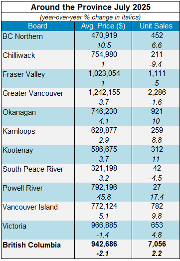Vancouver, BC – August 13, 2025. The British Columbia Real Estate Association (BCREA) reports that 7,056 residential unit sales were recorded in Multiple Listing Service® (MLS®) Systems in July 2025, up 2.2% from July 2024. The average MLS® residential price in BC in July 2025 was $942,686, down 2.1% compared to $963,047 in July 2024.