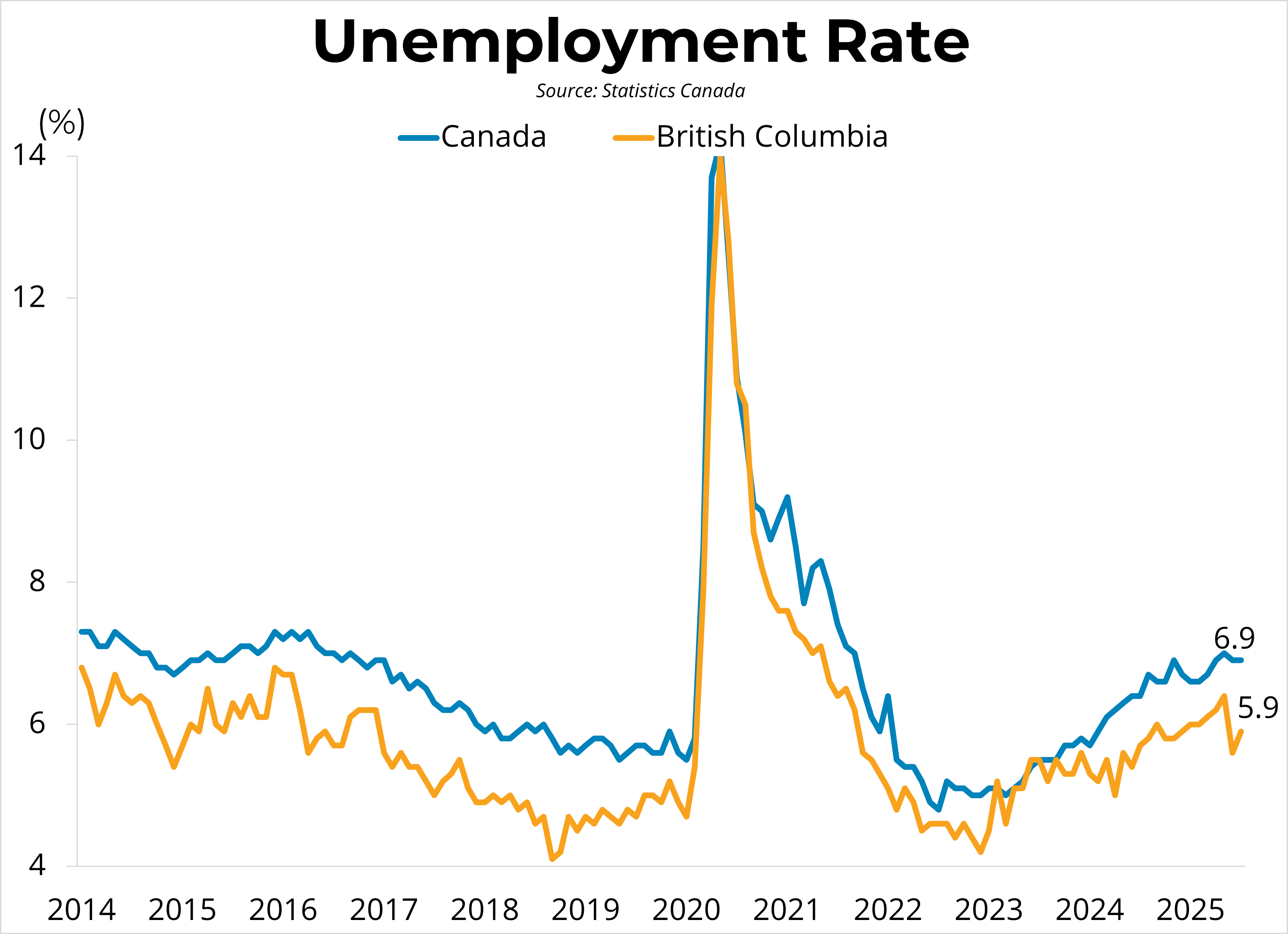 Employment in B.C. fell by 0.5% to 2.953 million, losing 16,300 jobs in July. Employment in Metro Vancouver fell by 2.2% to 1.697 million. The unemployment rate in B.C. increased by 0.3 points to 5.9%, while Vancouver's rate rose by 0.3 points to 6.1%.
