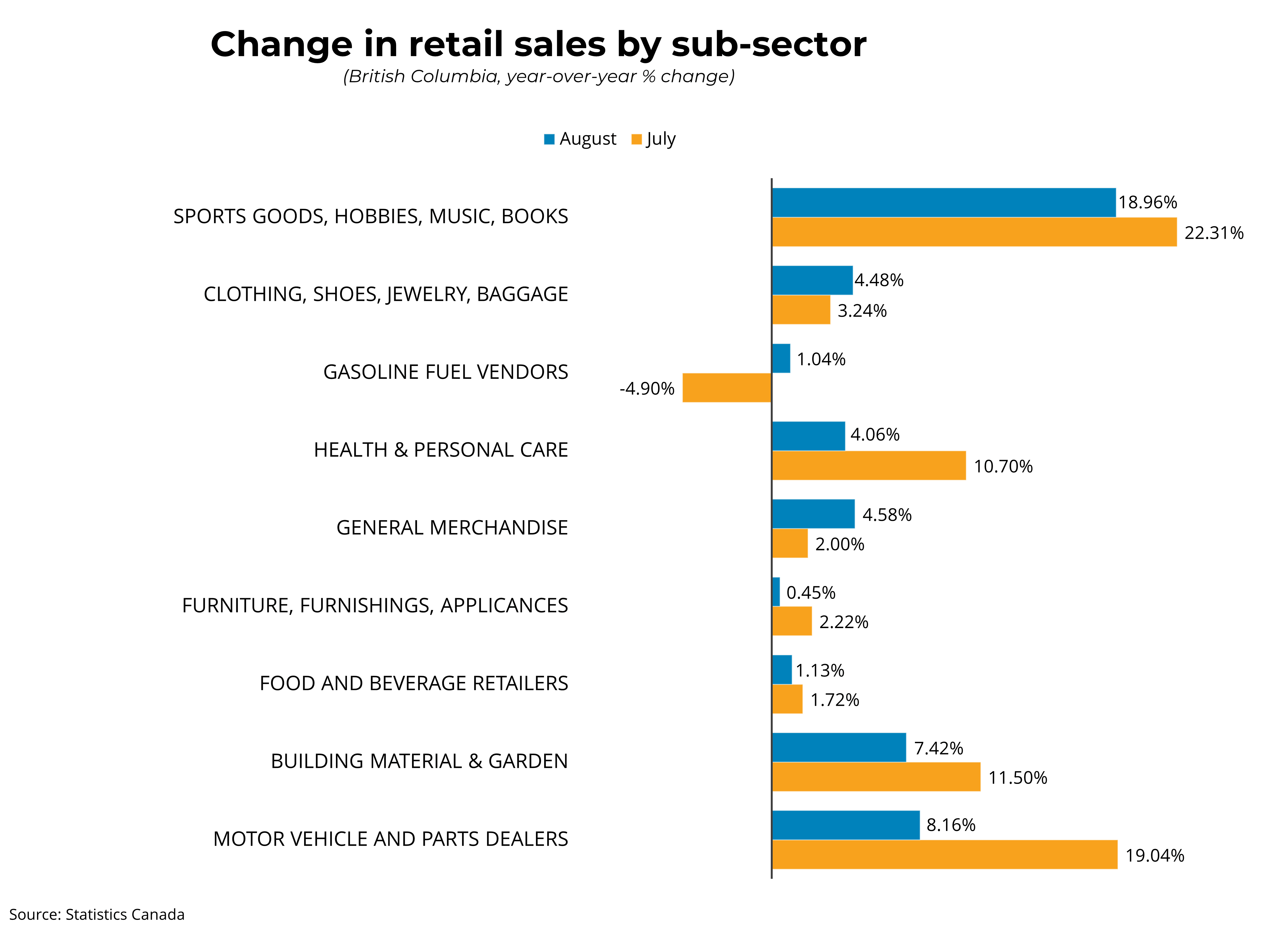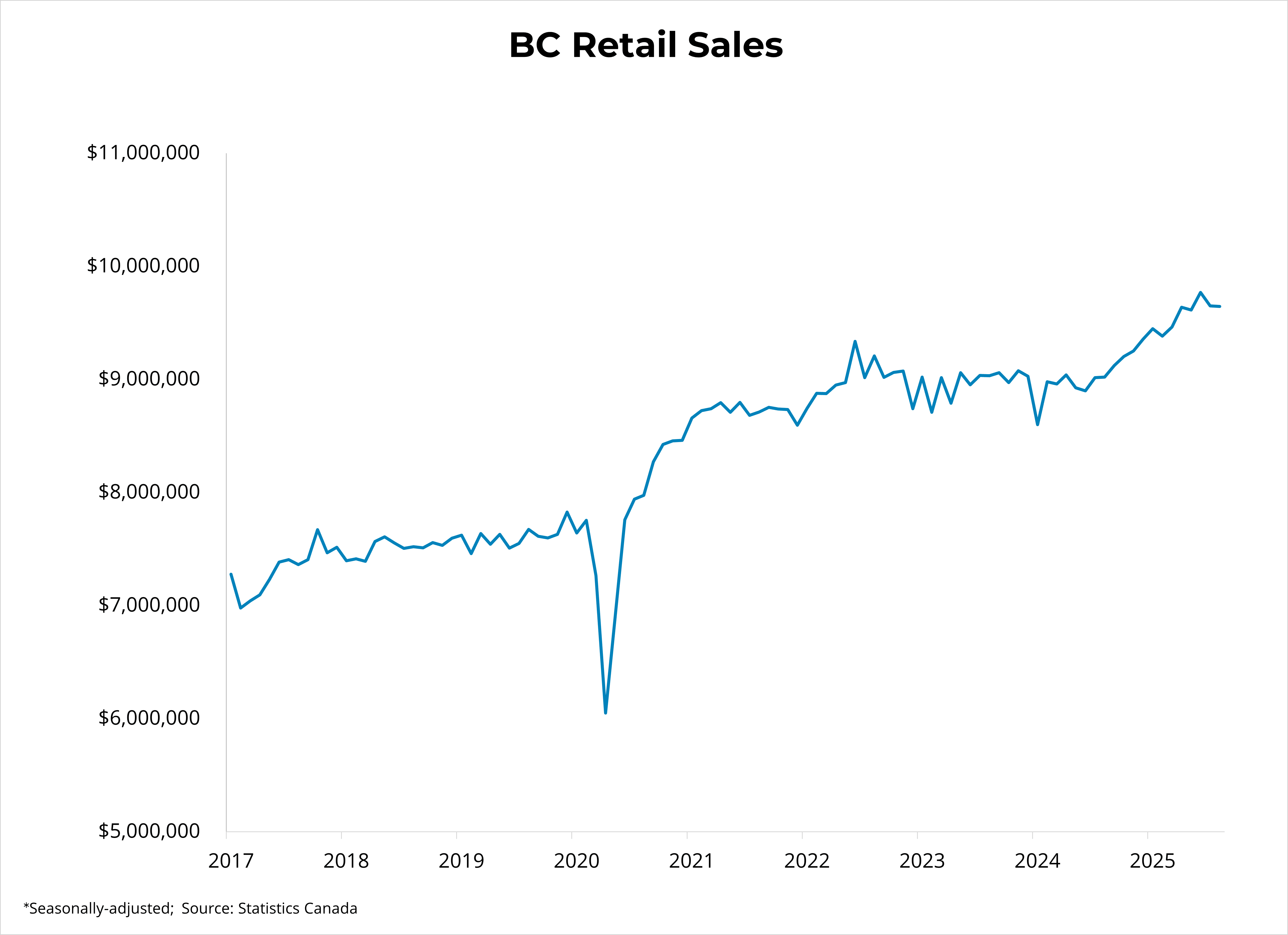 Retail sales in British Columbia were largely unchanged in August from the previous month and rose by 6.9 per cent compared to the same time last year. In the CMA of Vancouver, retail sales were down 0.8 per cent from the prior month and were 5.9 per cent above the level of August 2024.