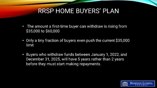 Increase the RRSP Home Buyers’ Plan limit from $35,000 to $60,000 and extend the three-year payback period.