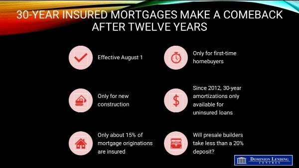 Allowing 30-year mortgage amortizations for first-time home buyers purchasing new builds. This measure zeroes in on a small subset of the market. In general, though, it stokes excess demand and ultimately does little to improve affordability once prices adjust. Also, limits on the size of insured mortgages mitigate its impact in the most expensive cities. Pre-construction sales usually require a 20% downpayment, which limits the use of insured mortgages, which account for only 15% of mortgage originations.