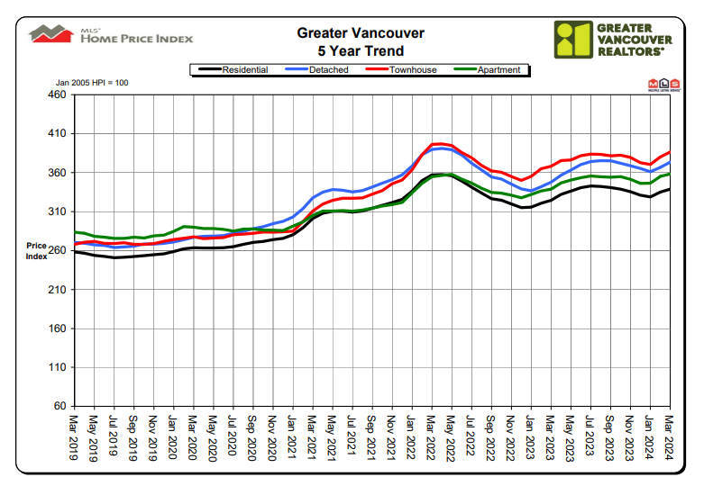 The MLS® Home Price Index composite benchmark price for all residential properties in Metro Vancouver is currently $1,196,800. This represents a 4.5 per cent increase over March 2023 and a 1.1 per cent increase compared to February 2024.