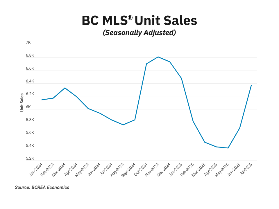 Vancouver, BC – August 13, 2025. The British Columbia Real Estate Association (BCREA) reports that 7,056 residential unit sales were recorded in Multiple Listing Service® (MLS®) Systems in July 2025, up 2.2% from July 2024. The average MLS® residential price in BC in July 2025 was $942,686, down 2.1% compared to $963,047 in July 2024.