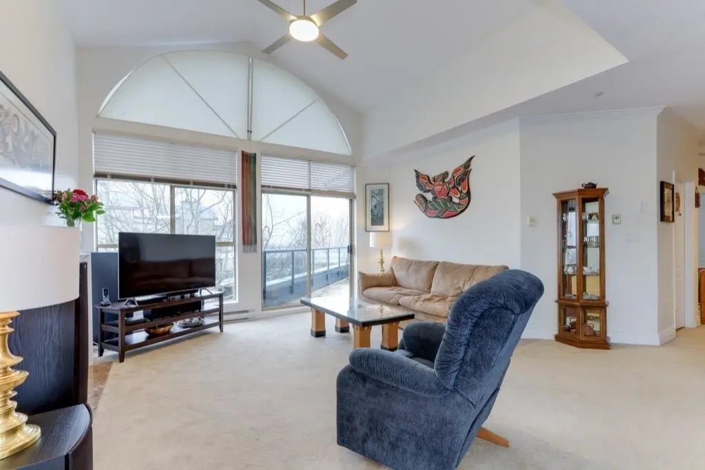 RARE OPPORTUNITY! Discover this spacious updated penthouse featuring 2 bedrooms plus a den, designed with an open-concept layout and soaring vaulted ceilings. Enjoy breathtaking interior and exterior views from two decks, showcasing Mt. Baker, Vancouver Island, the marina, and freighters navigating the Fraser River. As an end corner suite, it boasts additional windows that flood the space with natural light, creating a warm and inviting atmosphere.