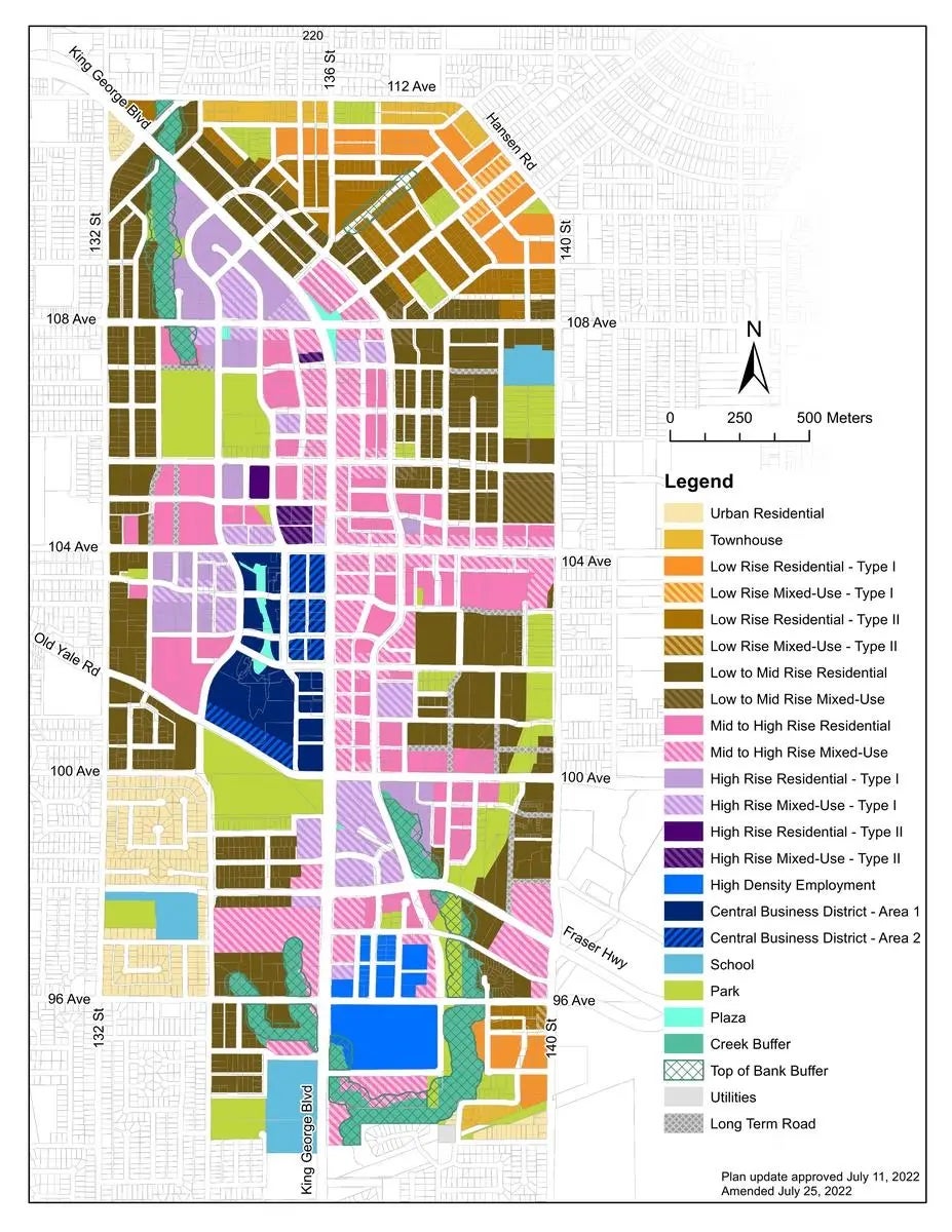 Attention Developers and Investors! Exciting opportunity for a land assembly under the Surrey City Centre Plan. Ideal for low-to-medium-rise development, the other 3 joint properties can be sold together which make nearly 35,000 SF, strategically located at a two-road intersection. Designated multi-family in OCP, Good for investors and developers. Please go to the city for more information. Land value only. Land over 11000 Sf, House has 5 bedrooms 3 full bathrooms; two kitchens currently rented. Close to City Hall, Surrey Central Skytrain Station, Gateway Station, SFU, and Shopping Center Back lane access.
