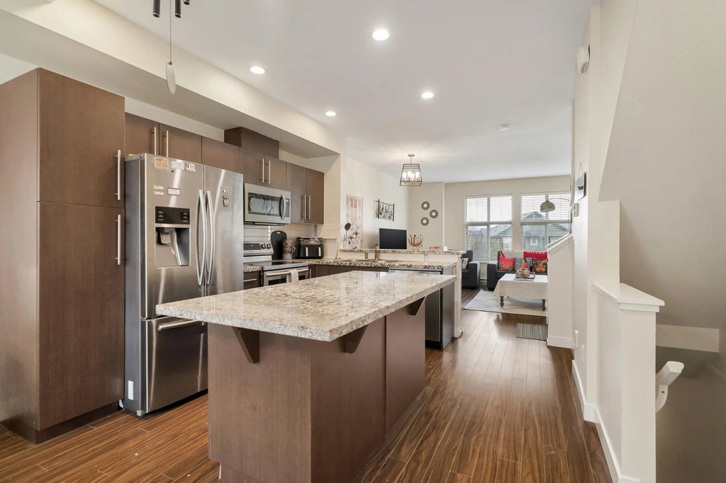 Augusta Walk at the top of Provinceton!! Bright & spacious 1,340 sqft townhome has 3 bedroom & 2 bathrooms up plus a powder room on the main floor. Fairly new paint & flooring, hot water tank (2022). Home features wide plank dark laminate flooring, granite countertops, stainless steel appliances, 9ft ceilings, built in vacuum plus more. Bright wide-open concept on main floor with large family room. Great location in Provinceton with easy access to highway and close to schools. Walking distance to proposed new skytrain coming down Fraser Hwy!!