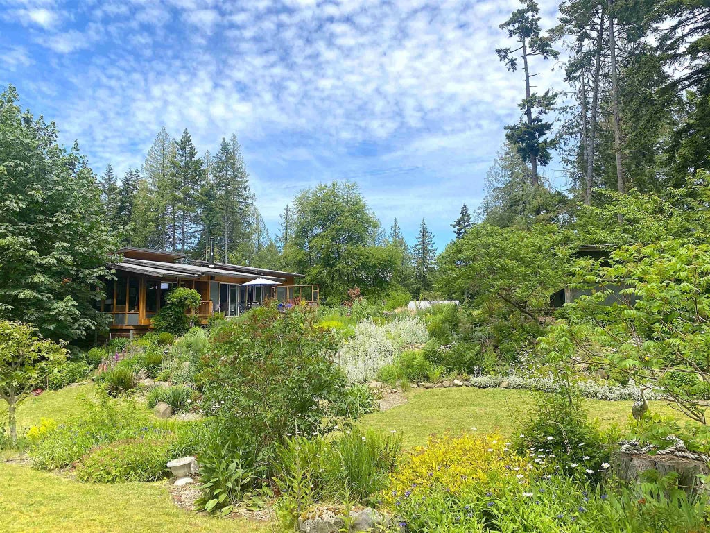 OCEANVIEW OASIS Secret garden sanctuary nestled atop coveted Cottage Way. Discover this beautifully designed 1-bed, 2-bath cottage and studio amidst a jaw-dropping flower garden with peek-a-boo ocean views. This modern home boasts quality finishes including cedar beams, maple floors, shiplap ceilings, floor-to-ceiling windows, and granite counters. Embrace nature on the enclosed patio, surrounding sundecks, and charming gazebo. Studio includes a 3-piece bath. Raised veggie beds and a greenhouse await your touch. Zoning allows for the addition of a house. This stunning property is a short walk to Bodega Ridge Provincial Park and adjacent to 66 acres of the Laughlin Lake wetland reserve. Experience privacy and serenity in one of Galiano’s most sought-after locations!