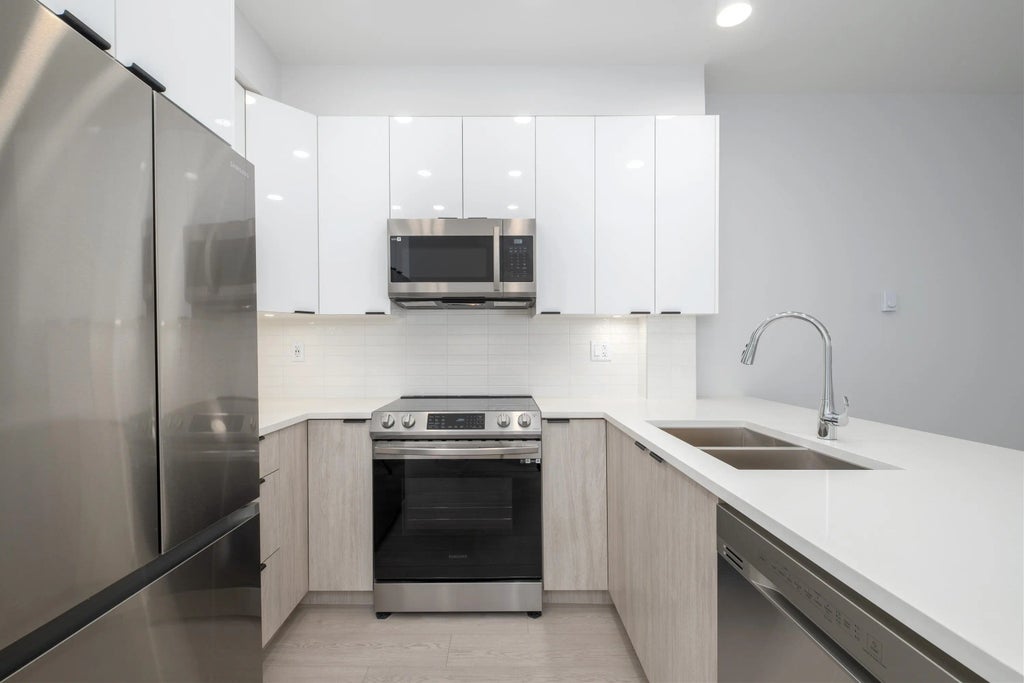 This north-facing 1 bed, 1 bath unit in the sold-out GENESIS by Whitetail Homes offers 479 sq ft of bright, open-concept living. Recently fully redone after an insurance claim, it features brand new quartz counters, stainless steel appliances, wide-plank laminate flooring, and a spa-style bath and 9 foot ceilings. Enjoy year-round use of the covered patio. The building offers excellent amenities including a gym, landscaped courtyard with putting green, and meeting rooms. Located steps from future SkyTrain, shopping, restaurants, and schools. Rentals and 2 pets allowed—ideal for investors or first-time buyers!