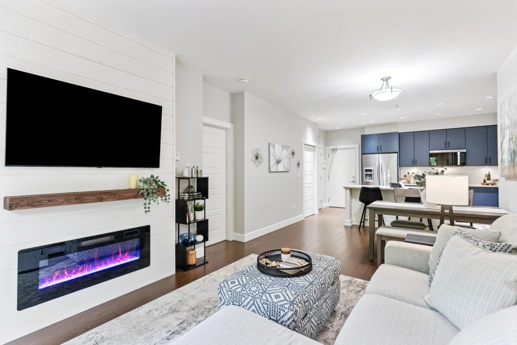 Welcome to Edgewater, South Surrey’s premier gated resort-style community! This beautifully updated 2-bedroom, 2-bath home features bedrooms on opposite sides for privacy and a spacious living area opening to a large covered deck. Updates include fresh paint, new kitchen cabinet doors, custom inserts, hardware, fridge cabinet, and walk-in pantry. The main bath has new counters, sink, and hardware, while the ensuite boasts a stunning walk-in shower with glass barn door plus refreshed cabinetry and laundry closet. A rebuilt floor-to-ceiling shiplap fireplace with modern mantle and electric insert completes the stylish space. Enjoy resort amenities—pool, hot tub, gym, theatre, guest suite—close to shops, golf, and major routes.