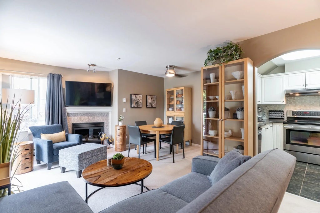 FRASER COURT TERRACE! This beautifully maintained corner unit offers 2 bedrooms and 2 bathrooms across 889 sq ft of comfortable living. Nearly 200 sq ft of private wraparound patio invites you to relax and enjoy peaceful mountain views. The kitchen was tastefully renovated in 2018 with quartz countertops, modern cabinetry, and stainless steel appliances. Additional features include in-suite laundry and a cozy gas fireplace. Located in a well-managed building, this home is within walking distance of shops, transit, and parks. A wonderful blend of comfort and convenience.