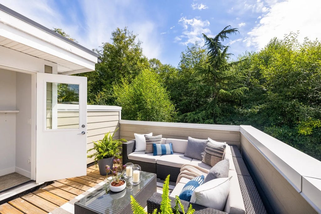 Welcome to The Woods by Gramercy. Check out this rare 3-lvl end-unit TH tucked in a quiet, forested pocket of Grandview, offering 3BRs (+ bonus studio on ground lvl w/sep entrance) & 1754sf of well-designed space, feat. 9' ceils & laminate flrs on main, quartz counters & quality SS appl's. Enjoy a 400+sf sunny roof deck (perf for entertaining, hosting BBQs & all-around summer lounging) + a private south-facing balc. Located in a quieter, back section of the complex, this home offers great privacy & safety for families, backs onto protected green space & the main-lvl studio is ideal for live/work. Dbl tandem garage w/epoxy flrs & extra storage. Clubhouse avail for private events. Close to Morgan Crossing, Hwy 99, beaches & more. You’ll feel right at home here!
