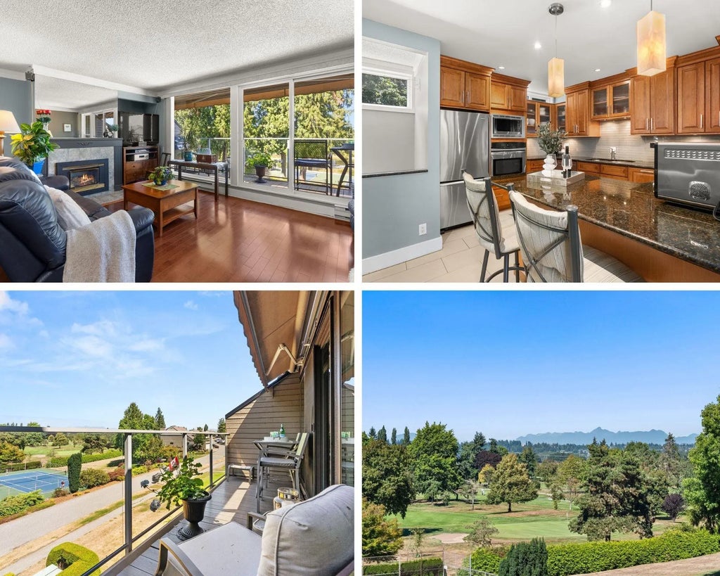 76 acres of RESORT living in beautiful South Surrey. Step into 1500+ SF of luxury in this beautiful 2-bedroom, 2-bathroom top-floor home. Enjoy sweeping views of golf course, mountains & Nicomekl River. The bright floor plan features a spacious kitchen w/ SS appliances, granite counters including breakfast bar & solid wood cabinets. The living & dining rooms showcase gorgeous HW flooring, floor-to-ceiling windows & a large deck to enjoy the views. Both bedrooms open to south facing balconies. Included with ownership are 2 golf memberships & access to an exceptional array of amenities: a clubhouse w/ restaurant, tennis & pickleball courts, indoor pool, gym, marina, & more. Enjoy scenic dyke walks, yoga classes & a family & pet-friendly community. Easy access to hwys being West of KG Hwy.