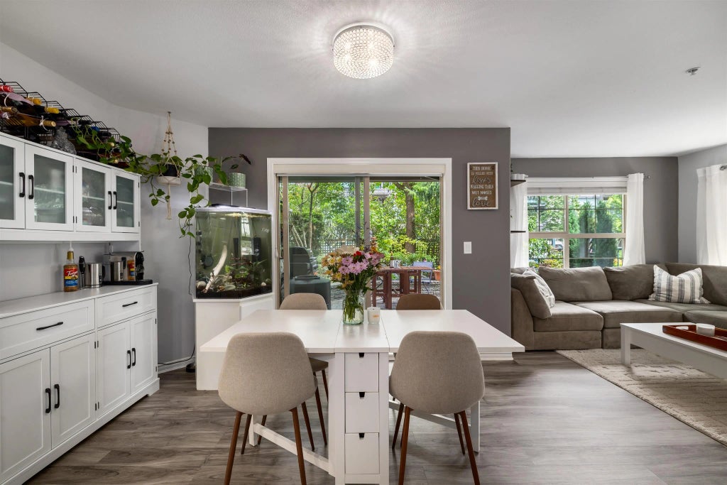 A beautifully updated GROUND LEVEL CORNER UNIT offering an expansive, open-concept layout and exceptional privacy. Large windows and sliding glass doors open to a 428 sq.ft. garden oasis, perfect for relaxing or entertaining. Thoughtful updates include new flooring, sleek kitchen countertops and backsplash, modern blinds, and more. Additional features include a generous laundry/storage room, and a spacious primary bedroom complete with a walk-in closet behind a barn door and en-suite. Enjoy the comfort of a gas fireplace (included in the strata fee), BRAND NEW ROOF, 2 SIDE-BY-SIDE PARKING STALLS + NO SHARED UNIT WALLS. Walking distance to transit, restaurants and shopping. Call today to book your private viewing!